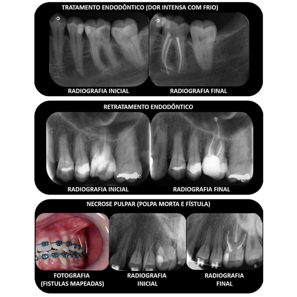 Especialidade que trata da parte interna do dente, popularmente conhecido como o canal, ou o nervo. São executados tratamentos em função da dor, de escurecimento, aparecimento de fistula ou bolinhas em cima dos dentes ou ainda retratamentos nos dentes que necessitam desses procedimentos.